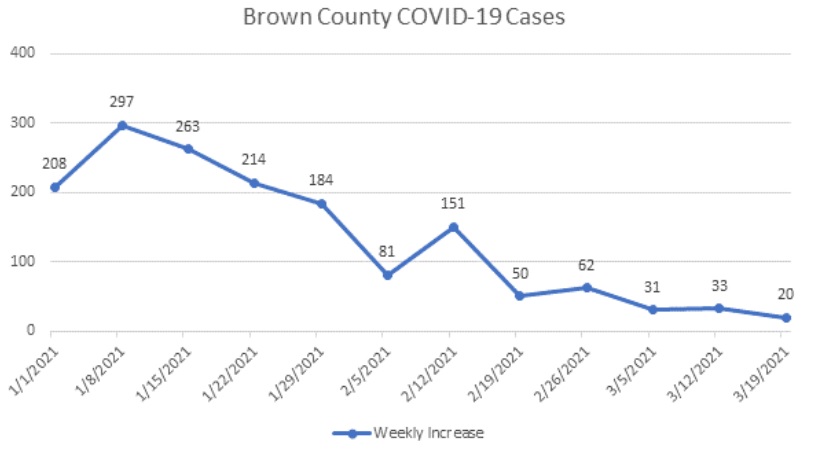 Brown County currently shows 5,141 people vaccinated with 1st doses, 2,268 people vaccinated with both doses. 30,883 is the estimated for vaccination.