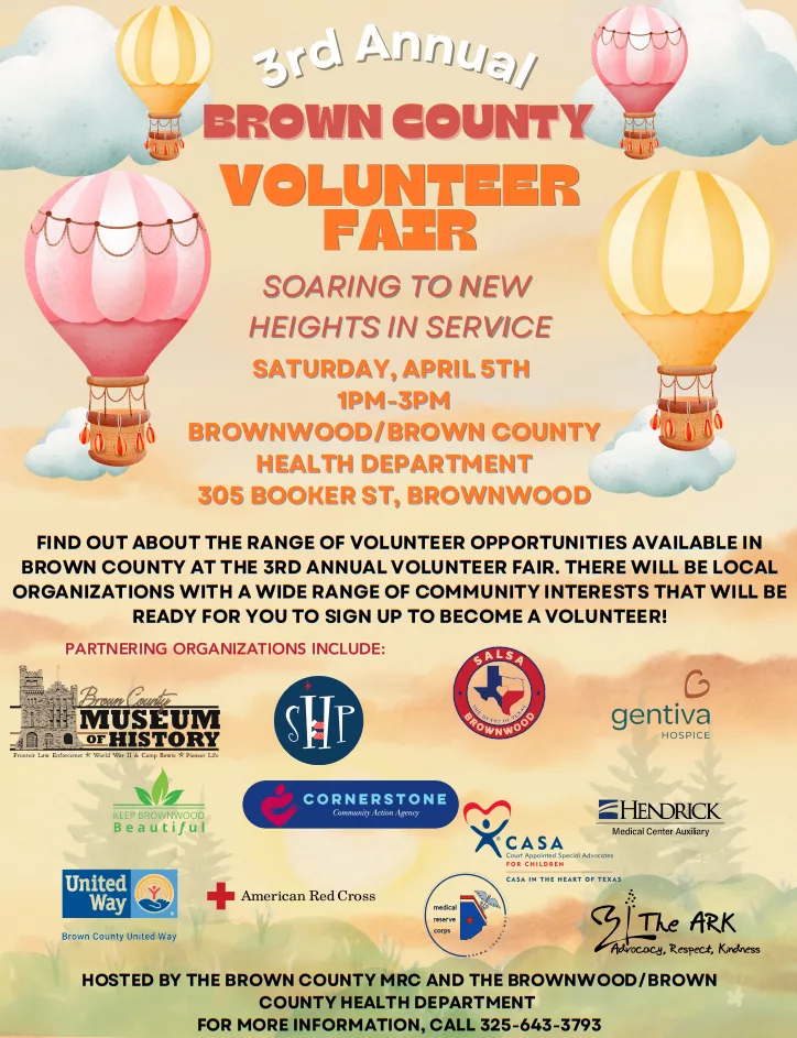 Attention Brown County! Are you looking for ways to give back to your community? Do you run a local organization in need of volunteers? Mark your calendars for the Brown County Volunteer Fair on Saturday, April 5th, from 1 to 3 PM at the Brownwood/Brown County Health Department!