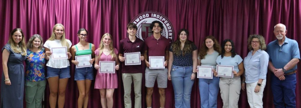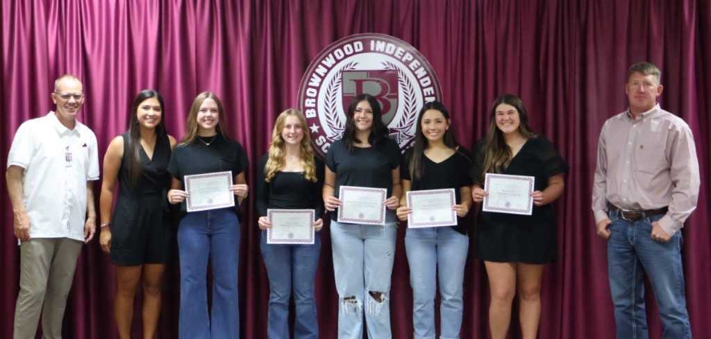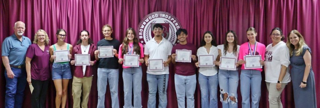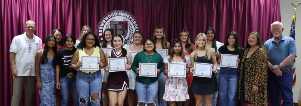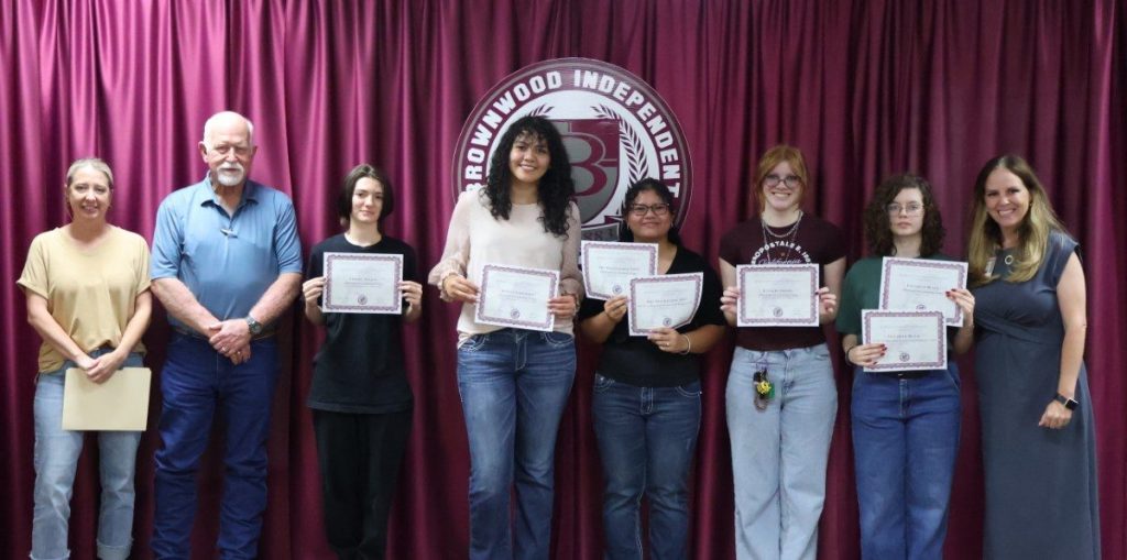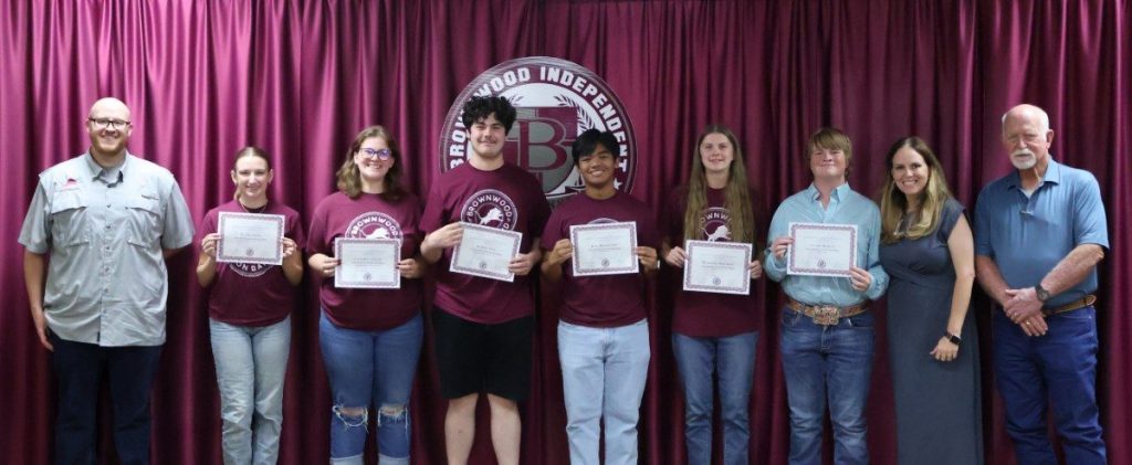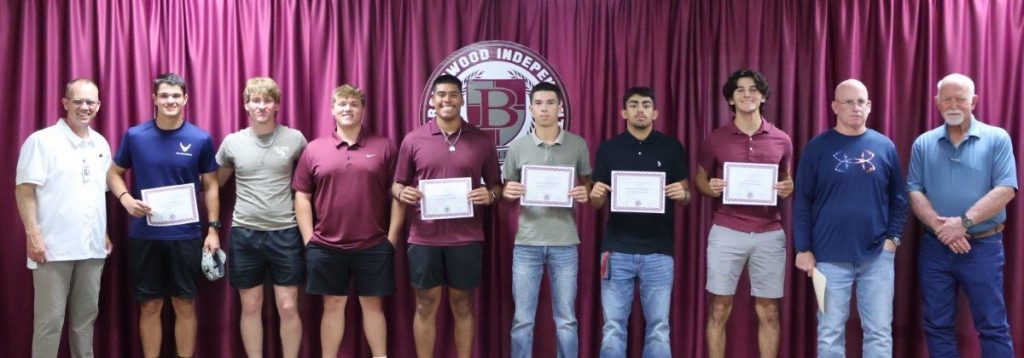 BHS Choir students, directed by Jennifer Reeves, earned UIL Concert and Sight-Reading Contest Sweepstakes (Treble Choir), UIL Concert and Sight-Reading Contest 1st Division Concert Award (A Capella Choir), Texas All-State Choir (Bennett Windham), and three State UIL Solo performers (Gale Balfour, Chloe Pringle, and Aqua Garcia). Honorees are pictured below with BISD Assistant Superintendent and Athletic Director Mitch Moore, BHS Baseball Coach Blake Sandford, and BISD Trustee Tim Wilson.