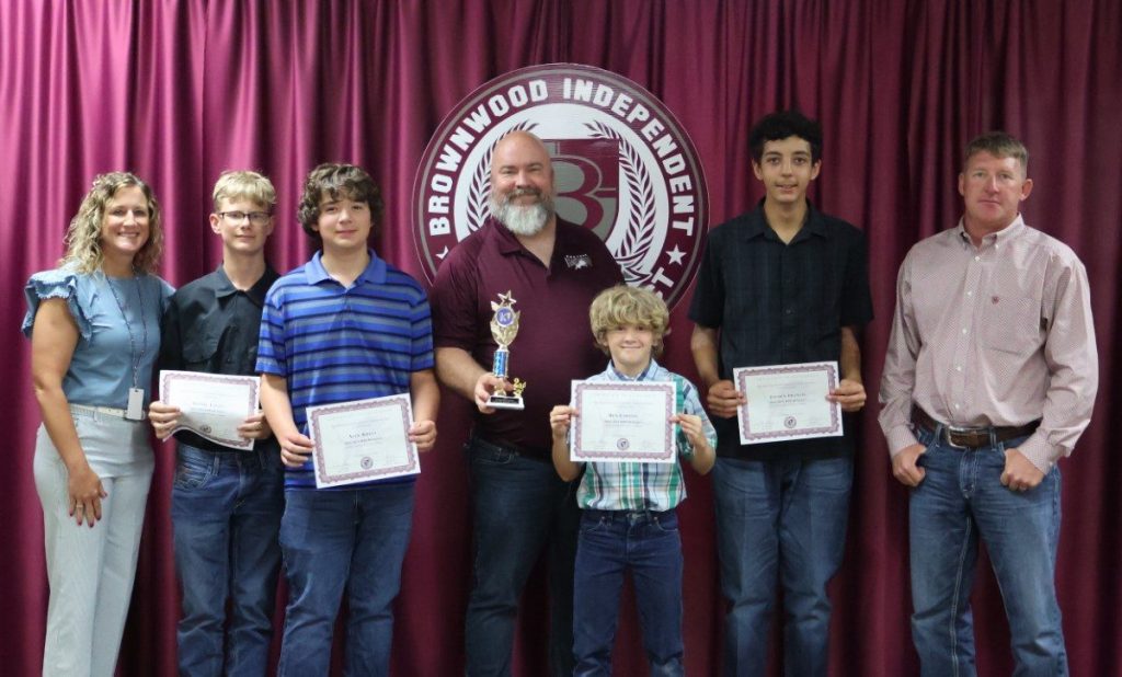 The following Brownwood Lion Band members qualified for State Solo & Ensemble: Cooper Morgan (Marimba), Madeleline Musgrove (Snare Drum), Kyle Recolizado (Alto Sax), and the Brass Quintet made up of Allison Fulton (Trumpet), Karter Shaw (Trumpet), Catherine Taylor (French Horn), Rachel Smith (Trombone), and Fonseca Estupinan (Tuba). Honorees are pictured below with BHS Assistant Band Director Ethan Yeats, BHS Principal Lindsay Smith, and BISD Trustee Tim Wilson.