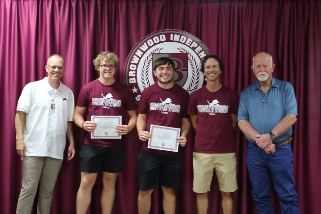 Coached by Dalton Hutchins, Varsity Lions Wesley Goodrich and Trine Baugh placed 3rd in Boys doubles at District competition. Honorees are pictured below with, BISD Assistant Superintendent and Athletic Director Mitch Moore, BHS Tennis Coach Dalton Hutchins, and BISD Trustee Tim Wilson.