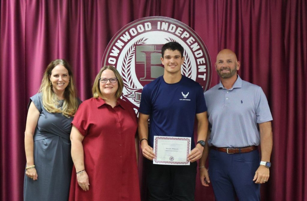 The following students were recognized for their enlistment or service in a branch of the United States military: Noah Holmes (Enlisted, United States Marine Corps), Austin Wright (Enlisted, United States Air Force), Wesley Isquierdeo (Enlisted, United States Air Force), Austin Goins (Serving, United States Marine Corps), Ryan Roan (Enlisted, United States Marine Corps), Ethan Miranda (Enlisted, United States Army). Austin Wright is pictured below with BHS Principal Lindsay Smith, BHS Counselor Jessica Morgan, and BISD Trustee Codie Smith.