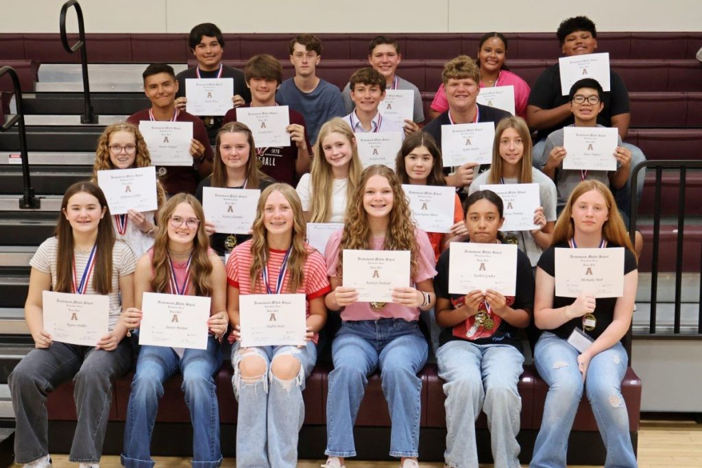 Grace Aguirre (PE), Maliyah Aubel (Honors English), Brooklyn Bouldin (A/V), Arely Carrere (Girls Team Tennis), Daniel Castillo (History), Kinsey Chandler (Select Treble Choir), Jackson Clark (Honors History), Casey Click (Advanced Art), Daniel Constancio (Ag Mechanics II), Roman Delgado (Family & Consumer Science), Roman Delgado (History), Grayson Dempsey (PE), Karson Gober (Art), Caroline Griffin (Digital Media), Kaiden Gruber (Honors Math), Judah Hamilton (Basketball), Kip Havens (Honors Science), Alayna Hernandez (Soccer), Breonna Hickerson (Applied Math), Kynlee Jefferson (Basketball), Audrey Keas (Volleyball), Bryan Kennedy (Math), Benjamin Lawton (Cross Country), Jakob Limon (Boys Team Tennis), Mayela Lopez (Math), Michaela Mair (Science), Michaela Mair (Cub Choir), Rylan Martin (Algebra), Rylan Martin (Track), Trinity Mendoza (Honors History), Vincent Montanez (Applied Reading), Jaycee Morton (Honors Math), Ailean Palacios (Cross Country), Kaden Peek (English), Kaden Peek (Football), Katelyn Penland (Robotics), Madison Putman (Tech Apps), Madison Putman (Teen Leadership), Bellah Stokes (Track), Giovanni Zamora (PE)