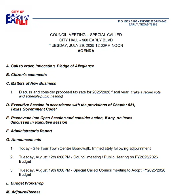 Proposed tax rate on agenda for special Early City Council meeting July 29