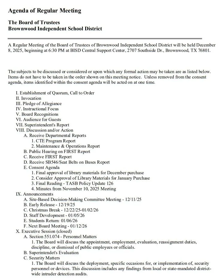 Brownwood ISD Board of Trustees to meet Dec. 8