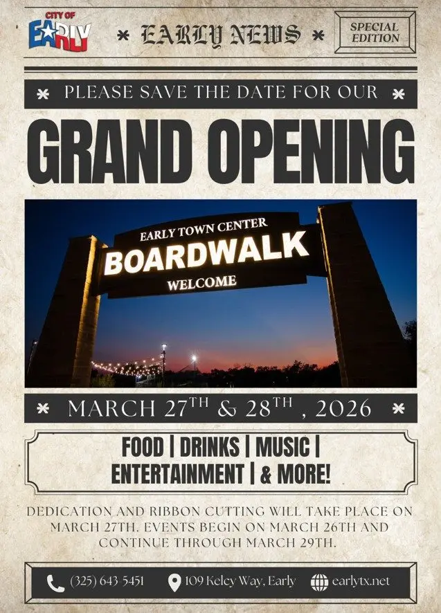 The City of Early has announced the grand opening of the Boardwalk at the Early Town Center will take place the weekend of March 27-28