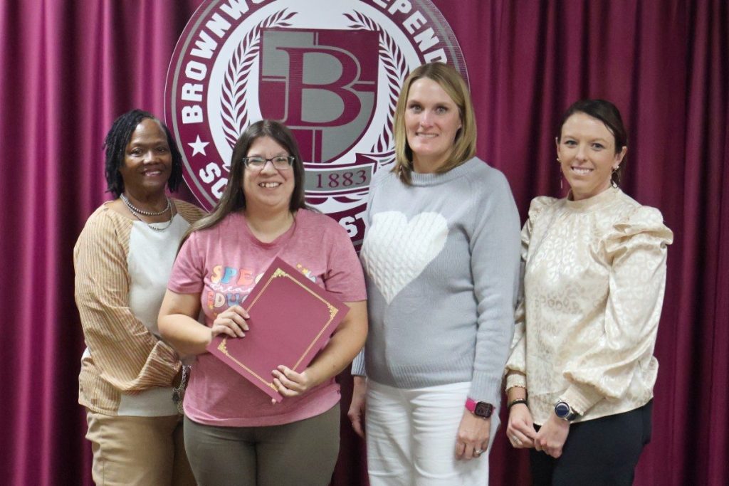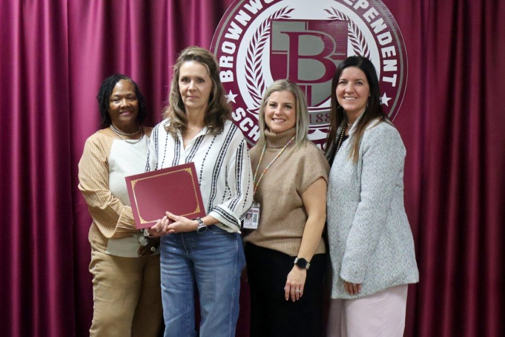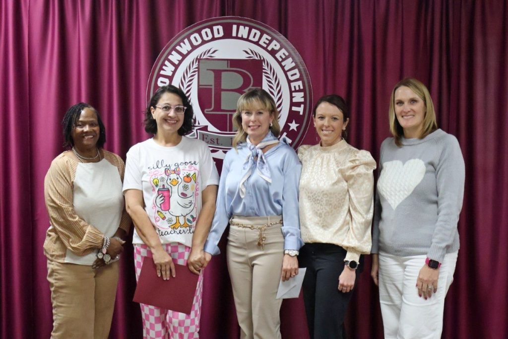 The BISD Spotlight recognizes members of the faculty and staff who go the extra mile to ensure excellence in education for all BISD students. Spotlight recipients are chosen from peer nominations and awards are provided through a sponsorship by Jacobs Family Pharmacy and Brownwood Education Foundation. February 2026 honorees were Northwest Elementary teacher Denice Bessent and Coggin Elementary Life Academics teaching assistant Megan Carrillo. Spotlight honorees are pictured with BISD Trustee Diane Thompson and (top) Northwest Elementary Principal Amy Morris and Assistant Principal Shelby Vara, and (bottom) Coggin Elementary Dean of Students Brec Espinoza and Principal Kassie Parrish.