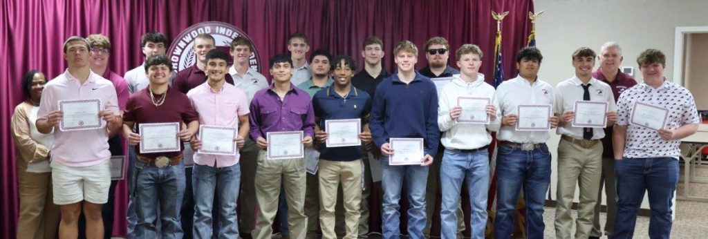 The 2025 Brownwood Lions led by Coach Brixey received several honors including 18 Academic All-District, 22 All-District Honors, 10 Big Country Preps All-Region, and 5 Academic All-State honors. Brownwood Lions players are pictured below with BISD Trustee Diane Thompson and Lions Head Football Coach Jeryl Brixey.