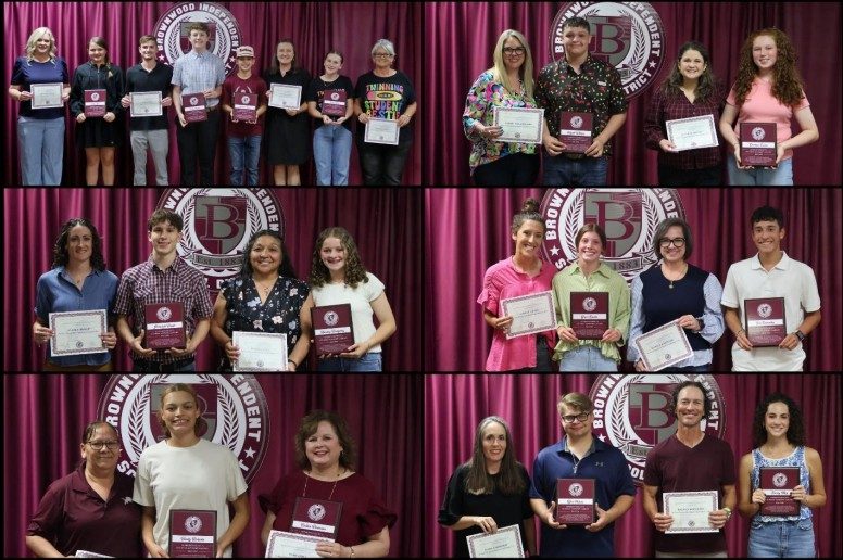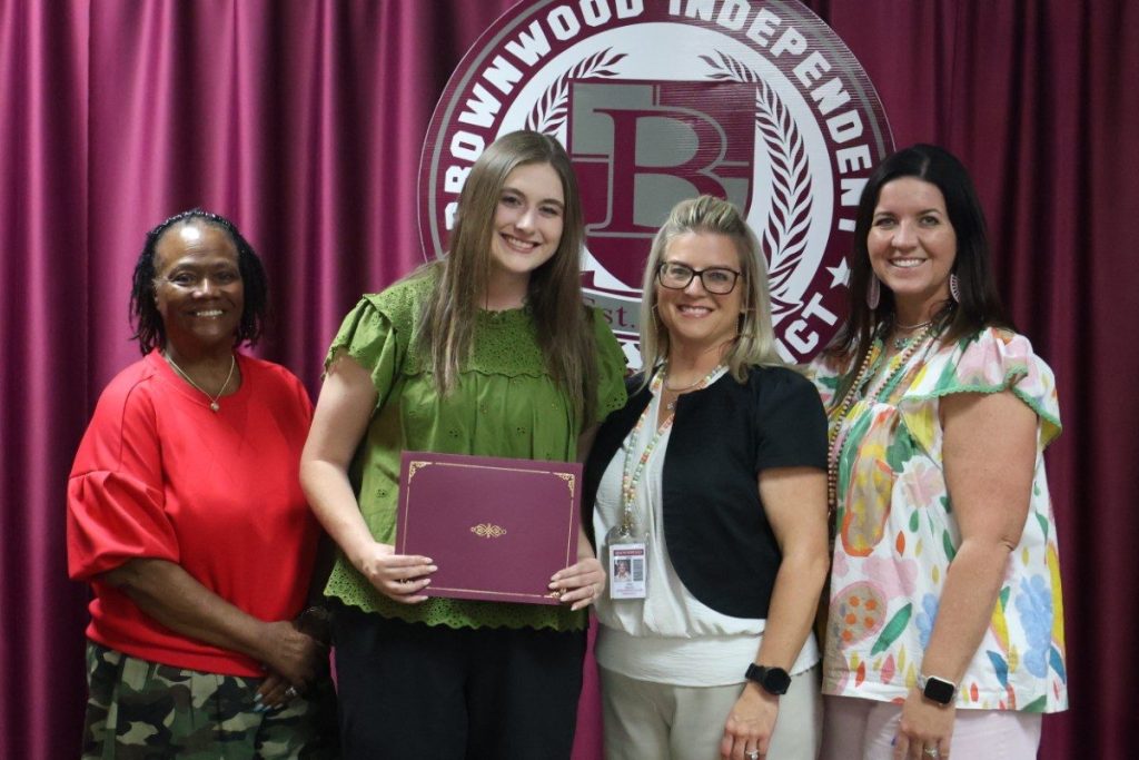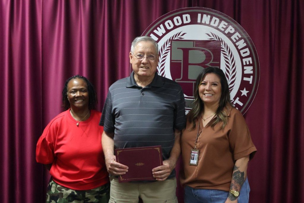 The Brownwood ISD Spotlight recognizes members of the BISD faculty and staff who go the extra mile to ensure excellence in education for all our students. Spotlight recipients are chosen from peer nominations. April 2026 honorees are Northwest Elementary fourth-grade teacher Zoe Moss and BISD bus driver Elvin Rogers. Pictured (top) are BISD Trustee Diane Thompson, Zoe Moss, Northwest Elementary Principal Amy Morris and Assistant Principal Shelby Vara, and (bottom) Trustee Thompson, Elvin Rogers, and BISD Transportation Director Maria Arellano.