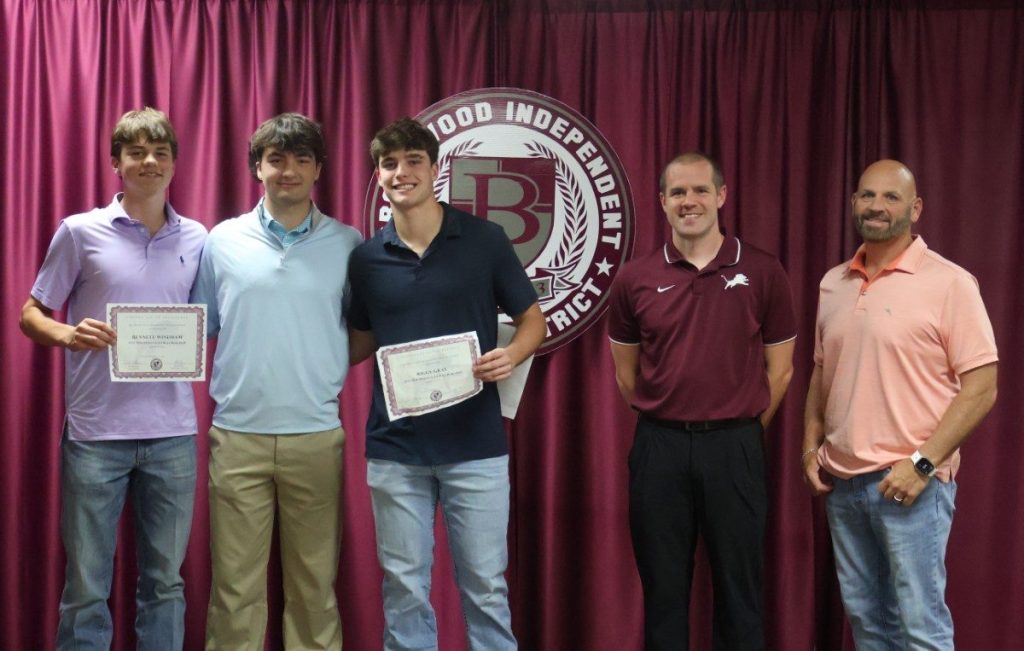 BHS Lions Powerlifting competitors were recognized for their season accomplishments, including four who qualified for Regionals and two who qualified for State. Honorees are pictured above with Coach Lee Grimes, Coach Kristen Grimes, and Trustee Wilson.
