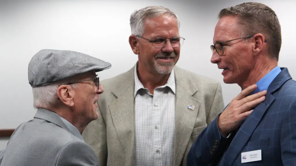 Early Mayor Bob Mangrum (left) talks with Assistant City Administrator Larry McConn (center) and City Administrator Tony Aaron after Mangrum’s State of the City address Friday.